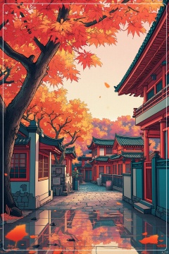 outdoors, tree, no humans, traditional media, building, scenery, autumn leaves, architecture, east asian architecture, autumn