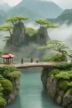 Captured from a high-angle perspective on a cloudy day, a Japanese bridge crosses over a body of water. The bridge is adorned with a few people walking on it, their arms stretched out in front of them. To the right of the bridge, a pagoda-like structure is visible. The pagoda is surrounded by lush green trees and rocks. In the background, a mountain range can be seen. The sky is covered in a thick fog, adding a touch of mystery to the scene.,Micro landscape,Ancient style scene