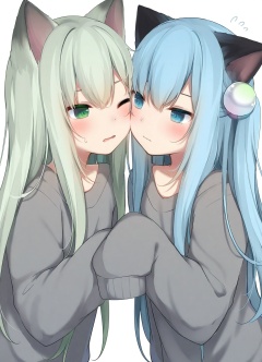 masterpiece, amashiro_natsuki, suichan_\(amashiro_natsuki\) or nekohashizuku_\(amashiro_natsuki\), sleeves_past_wrists, multiple_girls, animal_ears, 2girls, green_eyes, blue_hair, blue_eyes, long_hair, one_eye_closed, white_background, long_sleeves, hair_between_eyes, flying_sweatdrops, parted_lips, bangs, cat_ears, shirt, simple_background, upper_body, grey_shirt, green_hair, cropped_torso, blush, sleeves_past_fingers, heads_together, hair_ornament, grey_sweater, wavy_mouth, very_long_hair, cheek-to-cheek, one_side_up, hand_up
