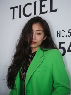 (RAW photo, 4k, realistic, exquisitely detailed skin),masterpiece,best quality,unity 8k wallpaper,ultra detailed,cinematic look,natural skin texture,extremely realistic skin texture,finely detailed face,(film grain:1.2),cinematic angle,Fujifilm XT3,Captured in a low-angle shot, a woman with long dark brown hair stands in front of a white backdrop. She is wearing a bright green suit jacket, her hair cascades over her shoulders, adding a pop of color to the otherwise monochromatic image. The backdrop is adorned with the word "TICIEL" in bold black letters, with the number "NO.54" written in a smaller black letters to the right of the image.