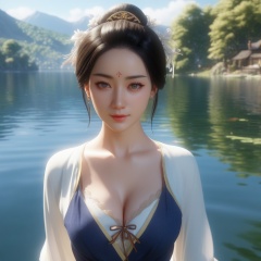<lora:831-DA-XL-国风E:0.8>, (,1girl, ,best quality, ),,  ,ultra detailed 8k cg,   ,masterpiece, (( , )) , lake,upper body,   (cleavage),,  (),