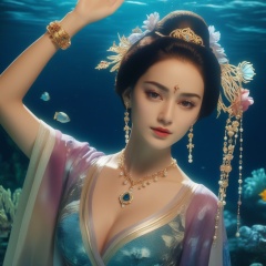 <lora:831-DA-XL-国风E:0.8>, (,1girl, ,best quality, ),,masterpiece, ((((, solo,  , ,solo focus, ,underwater, )))) ,ultra realistic 8k cg,   clean, masterpiece,     cinematic lighting, cinematic bloom,  (( , )),, , unreal, science fiction, luxury, jewelry, diamond, gold, pearl, gem, sapphire, ruby, emerald, intricate detail, delicate pattern, charming, alluring, seductive, erotic,(sit), , enchanting, hair ornament, necklace, earrings, bracelet, armlet,,(cleavage),,