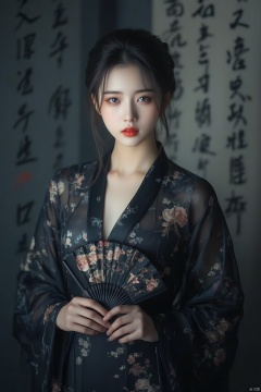 and her lips are a lighter shade of red. She's holding a black hand fan