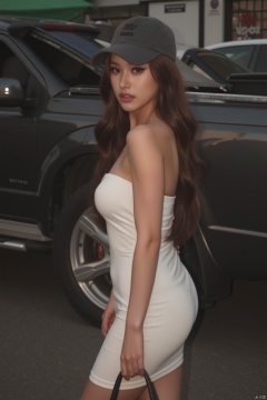 1girl, solo, long hair, looking at viewer, brown hair, black hair, hat, dress, brown eyes, jewelry, outdoors, parted lips, bag, white dress, lips, strapless, ground vehicle, baseball cap, realistic, photo background