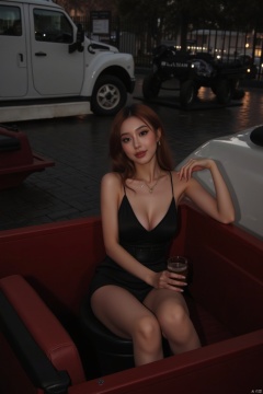 1girl, solo, long hair, breasts, looking at viewer, smile, large breasts, brown hair, black hair, brown eyes, jewelry, sitting, earrings, necklace, lips,ground vehicle, motor vehicle, realistic