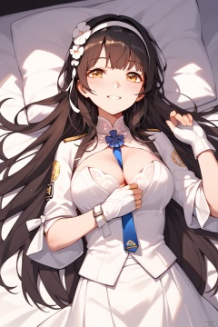 score_9,score_8_up,score_7_up,score_6_up,score_5_up,score_4_up,anime,high res image,masterpiece,best quality,source_anime,type 95 \(girls' frontline\),dgtype95,1girl,long hair,bangs,skirt,shirt,black hair,hair ornament,gloves,cleavage,brown eyes,yellow eyes,white shirt,flower,pantyhose,hairband,white gloves,hair flower,fingerless gloves,black pantyhose,white skirt,between breasts,white hairband,medium breasts,on back,from above,on bed,light smile,blush,