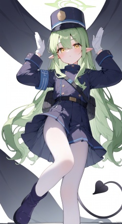 (score_9,score_8_up,score_7_up), 1girl,solo,(masterpiece:1.3),( beautiful:1.2),(high quality:1.2),(finely detailed:1.2),extremely detailed CG unity 8k wallpaper,best quality,a very delicate and beautiful,perfect fingers,1girl, solo, long hair, looking at viewer, blush, bangs, skirt, simple background, shirt, gloves, long sleeves, hat, white background, hair between eyes, very long hair, standing, jacket, tail, full body, yellow eyes, pantyhose, pleated skirt, boots, green hair, necktie, pointy ears, white gloves, bag, black footwear, uniform, arms up, blue skirt, black headwear, halo, backpack, demon tail, armband, peaked cap, white pantyhose, purple footwear,hikariBA,loli