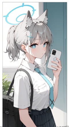(score_9,score_8_up,score_7_up), 1girl,solo,(masterpiece:1.3),( beautiful:1.2),(high quality:1.2),(finely detailed:1.2),extremely detailed CG unity 8k wallpaper,best quality,a very delicate and beautiful,perfect fingers,1girl, solo, looking at viewer, bangs, blue eyes, skirt, shirt, hair ornament, holding, animal ears, closed mouth, school uniform, white shirt, ponytail, short sleeves, grey hair, sidelocks, pleated skirt, necktie, collared shirt, black skirt, medium hair, bag, from side, animal ear fluff, plaid, halo, plaid skirt, phone, border, wolf ears, cellphone, bright pupils, smartphone, extra ears, white border, holding phone, school bag, pocket, blue necktie, shoulder bag, shirt tucked in, breast pocket, cross hair ornament, black bag, mismatched pupils, shiroko \(blue archive\)