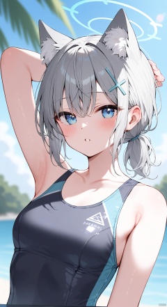 (score_9,score_8_up,score_7_up), 1girl,solo,(masterpiece:1.3),( beautiful:1.2),(high quality:1.2),(finely detailed:1.2),extremely detailed CG unity 8k wallpaper,best quality,a very delicate and beautiful,perfect fingers,1girl, solo, breasts, looking at viewer, blush, bangs, blue eyes, hair ornament, animal ears, hair between eyes, bare shoulders, small breasts, collarbone, swimsuit, upper body, ponytail, grey hair, outdoors, parted lips, hand up, medium hair, armpits, blurry, arm up, tree, animal ear fluff, one-piece swimsuit, bare arms, blurry background, halo, extra ears, low ponytail, competition swimsuit, palm tree, black one-piece swimsuit, cross hair ornament, multicolored swimsuit, mismatched pupils, shiroko \(blue archive\), shiroko \(swimsuit\) \(blue archive\)