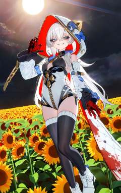 8k, best quality, masterpiece, (ultra-detailed), (high detailed skin), by au_\(d_elete\), safe, extra_sharp, (perspective composition.:1.2), (bold_lines are adding to the overall style:1.2) solo, (high brightness:1.3), backlighting, sunflower field, outdoors, kubrick stare, 1girl, contrapposto, blood on face, blood splatter, narrowed eyes, half-closed eyes, empty black eyes, bold eyelashes, long eyelashes, no pupils, nose, closed mouth, wide grin, crazy smile, blood on clothes, grey hair, long hair, cloudy sky, black sky, red clouds, amazing quality, masterpiece, highres, beautiful color, film grain, newest, <lora:dlstianming-a3-Tanger-000013:0.8>, hood, dlstianming, 1girl, thighhighs, blue eyes, white footwear, long hair, hood up, white hair, breasts, hair between eyes, bangs,