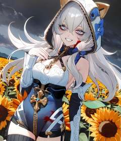 8k, best quality, masterpiece, (ultra-detailed), (high detailed skin), by au_\(d_elete\), safe, extra_sharp, (perspective composition.:1.2), (bold_lines are adding to the overall style:1.2) solo, (high brightness:1.3), backlighting, sunflower field, outdoors, kubrick stare, 1girl, contrapposto, blood on face, blood splatter, narrowed eyes, half-closed eyes, empty black eyes, bold eyelashes, long eyelashes, no pupils, nose, closed mouth, wide grin, crazy smile, blood on clothes, grey hair, long hair, cloudy sky, black sky, red clouds, amazing quality, masterpiece, highres, beautiful color, film grain, newest, <lora:dlstianming-a3-Tanger-000013:0.8>, hood, dlstianming, 1girl, thighhighs, blue eyes, long hair, hood up, white hair, breasts, hair between eyes, bangs, upper body,