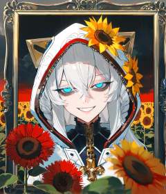 8k, best quality, masterpiece, (ultra-detailed), (high detailed skin), border, oil painting border, photo frame, frame, a carefully framed painting, by au_\(d_elete\), safe, extra_sharp, (perspective composition.:1.2), (bold_lines are adding to the overall style:1.2) solo, (high brightness:1.3), backlighting, sunflower field, outdoors, kubrick stare, 1girl, contrapposto, blood on face, blood splatter, narrowed eyes, half-closed eyes, empty black eyes, bold eyelashes, long eyelashes, no pupils, nose, closed mouth, wide grin, crazy smile, blood on clothes, grey hair, long hair, cloudy sky, black sky, red clouds, amazing quality, masterpiece, highres, beautiful color, film grain, newest, symmetrical composition, <lora:dlstianming-a3-Tanger-000013:0.8>, hood, dlstianming, 1girl, blue eyes, long hair, hood up, white hair, breasts, hair between eyes, bangs, upper body,
