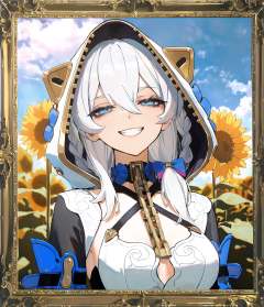 8k, best quality, masterpiece, (ultra-detailed), (high detailed skin), border, oil painting border, photo frame, frame, a carefully framed painting, by au_\(d_elete\), safe, extra_sharp, (perspective composition.:1.2), (bold_lines are adding to the overall style:1.2) solo, (high brightness:1.3), backlighting, sunflower field, outdoors, kubrick stare, 1girl, contrapposto, half-closed eyes, detailed eyes, bold eyelashes, long eyelashes, nose, closed mouth, wide grin, smile, grey hair, long hair, blue sky, clouds, amazing quality, masterpiece, highres, beautiful color, film grain, newest, symmetrical composition, <lora:dlstianming-a3-Tanger-000013:0.8>, hood, dlstianming, dlstianming default clothes, 1girl, blue eyes, long hair, hood up, white hair, long sleeves,breasts, hair between eyes, bangs, upper body,