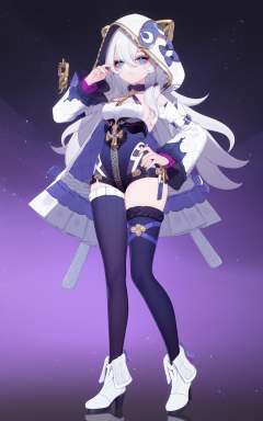 8k, best quality, masterpiece, (ultra-detailed), (high detailed skin), by nanoless, by misumi \(macaroni\), A full-body portrait of a young girl, standing gracefully, pastel art style, high-key lighting, shoujo manga influence, hd quality, delicate details, full body, full shot, standing, looking at viewer, (solo:1.2), simple background, white background, hand on own hip, <lora:dlstianming-atw-Tanger-000013:0.8>, hood, dlstianming, dlstianming default clothes, 1girl, thighhighs, blue eyes, white footwear, long hair, hood up, white hair, long sleeves, breasts, hair between eyes, bangs,