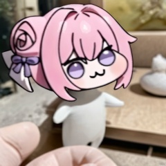 1girl, solo, looking at viewer, bangs, purple eyes, pink hair, multicolored hair, chibi, :3, parody, meme, photo background