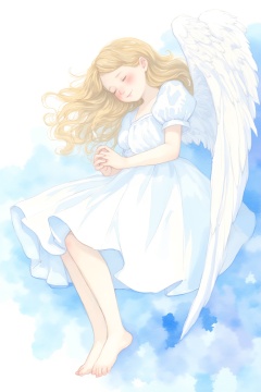 watercolor \(medium\), 1girl, solo, closed eyes, wings, dress, long hair, short sleeves, blonde hair, feathered wings, white dress, puffy sleeves, angel wings, painting \(medium\), own hands together, blush, puffy short sleeves, barefoot, angel, wavy hair, sleeping, blue dress, closed mouth, smile, full body, white wings, lying, ribbon, blue theme, fetal position, blue background, on side, monochrome, knees up, plantar flexion, brown hair