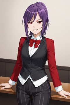 Seta Kaoru,smile, bangs, red eyes,ponytail, purple hair, sidelocks,<lora:熏-哈卡奈:0.8>