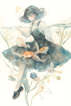 watercolor \(medium\), 1girl, solo, fish, dress, shirt, short hair, shoes, white shirt, blush, black dress, black footwear, long sleeves, collared shirt, blue eyes, plant, leaf, bubble, full body, half-closed eyes, white background, looking at viewer, painting (medium), bangs, black hair, loafers, pinafore dress, grey hair, simple background, blue hair, skirt, underwater, animal, surreal, medium hair, goldfish, air bubble, parted lips, aqua eyes, socks