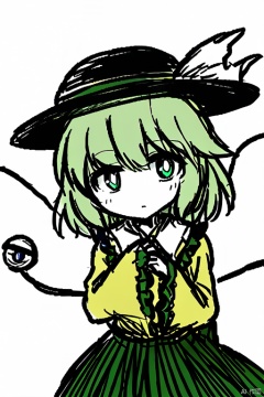,simple background,white background,greyscale,black and white line drawing,lineart,komeiji_koishi, 1girl, third_eye, yellow_shirt, black_hat, green_hair, frilled_sleeves, highres, frilled_shirt_collar, wide_sleeves, hat_bow, green_eyes, green_skirt, heart_of_string, yellow_bow, hat_ribbon,  diamond_button, yellow_ribbon, eyeball