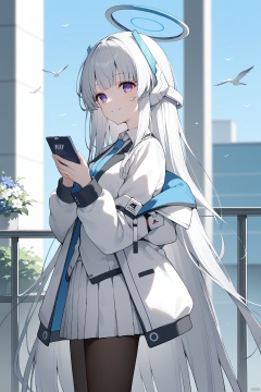 (score_9,score_8_up,score_7_up), 1girl,solo,(masterpiece:1.3),( beautiful:1.2),(high quality:1.2),(finely detailed:1.2),extremely detailed CG unity 8k wallpaper,best quality,a very delicate and beautiful,perfect fingers,1girl, solo, long hair, breasts, smile, bangs, skirt, shirt, long sleeves, very long hair, standing, purple eyes, jacket, white shirt, flower, white hair, pantyhose, pleated skirt, outdoors, open clothes, necktie, collared shirt, off shoulder, open jacket, black pantyhose, bird, headphones, halo, formal, white jacket, white skirt, suit, blue necktie, id card, mechanical halo, white suit, from side