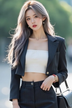 1girl, solo, long hair, looking at viewer, skirt, shirt, jewelry, jacket, white shirt, grey hair, earrings, outdoors, parted lips, midriff, striped, lips, crop top, makeup, formal, suit, lipstick, ground vehicle, watch, realistic, red lips, wristwatch