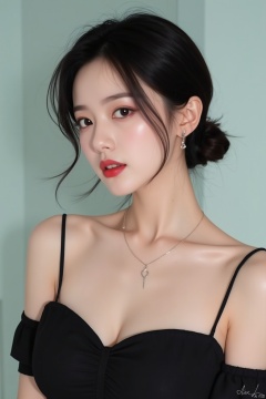 1girl, solo, breasts, short hair, black hair, dress, cleavage, bare shoulders, jewelry, medium breasts, collarbone, upper body, earrings, parted lips, hair bun, blurry, black eyes, black dress, lips, makeup, blurry background, single hair bun, lipstick, red lips