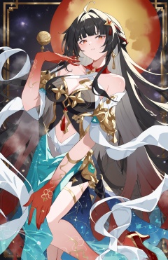 score_9, score_8_up, score_7_up, score_anime, A tarot card style illustration of a mature woman, haughty expression, wearing ornate clothing with regal, sharp edges, mirrored vertically, upper body only. The woman stands in an upright pose, creating symmetry. Background: Intricate, celestial patterns with stars and moon phases. Colors: deep blues, gold, and black tones, sharp contrast lighting with a mystical aura. Created using: baroque painting techniques, tarot symbolism, fine ink detailing, digital painting, mystical lighting, intricate pattern work, celestial elements, BREAK<lora:lingsha-pony-Tanger-000018:0.8>, lingsha, default clothes, red hands, red feet, 1girl, long hair, black hair, breasts, ahoge, high heels, BREAKTEST, masterpiece, best quality,