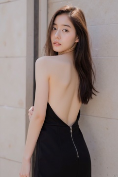 1girl, solo, long hair, looking at viewer, brown hair, black hair, dress, bare shoulders, upper body, parted lips, looking back, from behind, black eyes, black dress, arm up, lips, sleeveless dress, zipper, realistic