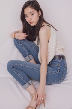 1girl, solo, long hair, looking at viewer, brown hair, black hair, jewelry, sitting, full body, parted lips, pants, high heels, bracelet, lips, arm support, sandals, denim, jeans, realistic