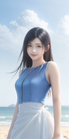 best quality, masterpiece, realistic,cowboy short,(Good structure), DSLR Quality,Depth of field,kind smile,looking_at_viewer,Dynamic pose, , Blue sky and white clouds on the beach,Masterpiece, (ultra wide angle lens: 1.2), Unity8k wallpaper, best quality, (detail shadow: 1.1), a beautiful girl, on a sea of light blue silk, translucent silk, floating light blue silk, surrealist style, minimalism, highly detailed texture, light blue, white clean background, CG rendering, light passing through clouds, 8k resolution, (motion photo: 1.2), (Fidelity: 1.4), original photos, movie lighting, 1girl,, , ,kind smile, , weddingdress, tifa,tifa lockhart,black hair