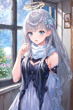 <lora:艺术家_岸田梅尔1-000015:1>, (The Starry Train and the Girls journey of starry train),(extremely detailed CG unity 8k wallpaper,masterpiece, best quality, ultra-detailed),(best illumination, best shadow, an extremely delicate and beautiful),dynamic angle,floating,fairyland,finely detail,Depth of field (bloom),(glass,glass sparkle,shine,overexposure),(girl in the starry train,starry train in the starry sky,starry sky in the wonderland),glinting stars,(watercolor medium),window,moon,detailed moon light,star,starry sky,cirrocumulus,flower,(1girl,cute,flying,bangs,blue eyes,dress,hair between eyes,hair ornament,halo,scarf,sidelocks,star (symbol),star hair ornament,silver hair),(solo),open mouth,!,ribbon,day,eyebrows visible through hair,silver hair,long silver hair,bangs,neck ribbon,very long hair,blush,hair between eyes,red ribbon,window,short sleeves,((the girl Hand and face ||/ the window,||/ the window:1.3) ,(fill the screen),(the girl is wearing silk silver gauze |dress:1.2),(silver silk gauze|dress:1.2),ornament ,hair ornament,starry|flowers ornamment,(fairy tale and dreamy spring niaght)