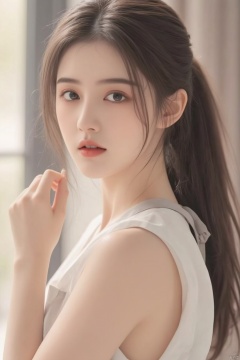 1girl, solo, long hair, looking at viewer, black hair, upper body, ponytail, parted lips, indoors, hand up, black eyes, apron, from side, lips, window, sunlight, realistic