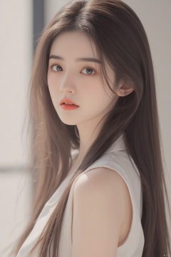 1girl, solo, long hair, looking at viewer, brown hair, shirt, black hair, closed mouth, upper body, sleeveless, indoors, blurry, from side, lips, window, sunlight, realistic, red lips, white blazer (module)