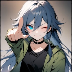 [[fu hua(honkai impact 3rd)]], nai3, 1girl, solo, artstyle,best quality,amazing quality,very aesthetic,absurdres,traditional media,female focus, 1girl, solo, long hair, looking at viewer, smile, bangs, blue eyes, shirt, black hair, long sleeves, hair between eyes, closed mouth, jacket, one eye closed, choker, v-shaped eyebrows, black shirt, black choker, border, pointing, ;\), green jacket, black border, pointing at viewer, fu hua