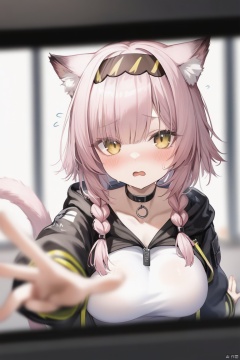 1girl, animal_ears, bangs, blurry, blurry_foreground, blush, braid, breasts, cat_ears, cat_girl, cat_tail, choker, depth_of_field, eyebrows_visible_through_hair, flying_sweatdrops, hairband, jacket, large_breasts, long_sleeves, looking_at_viewer,goldenglow_\(arknights\), motion_blur, pink_hair, pov, reaching_out, shirt, solo_focus, tail, yellow_eyes