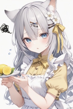 1girl, solo, long hair, looking at viewer, blush, bangs, blue eyes, simple background, hair ornament, white background, dress, bow, holding, animal ears, hair between eyes, flower, white hair, short sleeves, hair bow, grey hair, parted lips, food, hairclip, puffy sleeves, hair flower, apron, puffy short sleeves, hands up, fruit, flying sweatdrops, white flower, white apron, yellow bow, yellow dress, squiggle, lemon