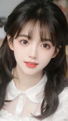 A close-up shot of a young Asian woman with dark brown eyes and dark brown hair. She is dressed in a white dress with a white blouse that has a ruffled collar. The background is blurred, but it is out of focus. The woman's lips are a vibrant shade of red. Her eyebrows are a darker shade of brown. She has a slight smile on her face, adding a pop of color to her face.