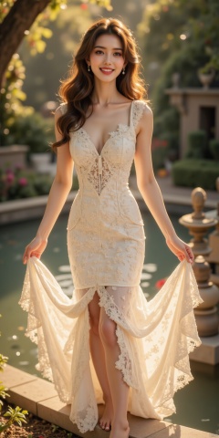 Real beauty stands elegantly beside a serene fountain in a lush garden, wearing a stunning white lace dress that accentuates her curves. The dress's V-neck design showcases her décolletage. Her long, chestnut-hued locks cascade down her back as she lifts the hem of her skirt with gentle hands, radiating sunshine warmth from her bright smile.