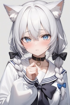 1girl, solo, long hair, looking at viewer, blush, bangs, blue eyes, simple background, shirt, long sleeves, bow, animal ears, hair between eyes, twintails, school uniform, white shirt, upper body, braid, white hair, hair bow, parted lips, serafuku, puffy sleeves, cat ears, hand up, sailor collar, grey background, twin braids, animal ear fluff, sleeves past wrists, black bow, low twintails, blue bow, puffy long sleeves, white sailor collar