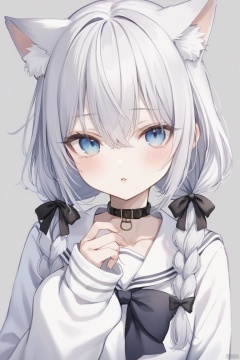 1girl, solo, long hair, looking at viewer, blush, bangs, blue eyes, simple background, shirt, long sleeves, bow, animal ears, hair between eyes, twintails, school uniform, white shirt, upper body, braid, white hair, hair bow, parted lips, serafuku, puffy sleeves, cat ears, hand up, sailor collar, grey background, twin braids, animal ear fluff, sleeves past wrists, black bow, low twintails, blue bow, puffy long sleeves, white sailor collar