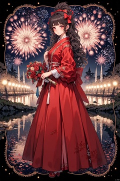 lolita fashion,masterpiece,best quality,1girl,pov,black hair,long hair,ponytail,nape,red eyes,light smile,looking at viewer,holding bouquet,lily \(flower\),red kimono,(fireworks),(aerial fireworks),firework background,(night),shrine,lake,light reflection \(water\),particles,