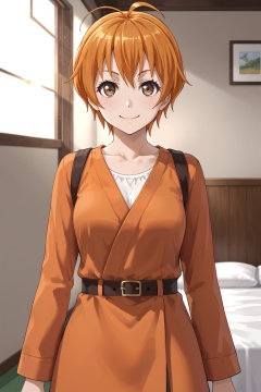 kitazawa hagumi, 1girl, solo, smile, short hair, orange hair, looking at viewer, :d, brown eyes, ahoge<lora:北澤育美:0.8>