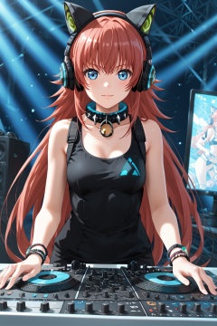 chuchu, 1girl, solo, long hair, bangs, blue eyes, animal ears, very long hair, red hair, fake animal ears, headphones, animal ear headphones, cat ear headphones<lora:chuchu-pony:0.8>