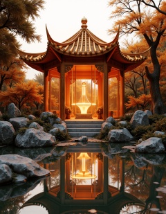 Best quality,masterpiece,ultra high res,(photorealistic:1.4),DFHJ,The image showcases a serene,traditional Asian-inspired garden. A golden-roofed pavilion stands prominently in the center,surrounded by a calm pond reflecting its glow. Autumnal trees,with leaves turning shades of orange and brown,provide a backdrop. The interior of the pavilion,illuminated by soft,warm lighting,reveals intricate details and ornate designs. The overall ambiance is one of tranquility and reverence.,