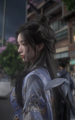 (ultra realistic,best quality),photorealistic,Extremely Realistic, in depth cinematic light,cute hubggirl, Limuwang_hubggirl, cityscape,lip biting,seductive leaning forward,detailed face,realistic,photorealistic,(studio light:1.2),Deep photo,depth of field,shadows,messy hair,seductive silhouette play,dark,nighttime,dark photo, solo, long hair, black hair, hair ornament, dress, hair bun, tree, blue dress, chinese clothes