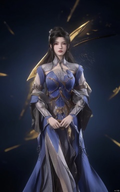 A stunning 8K digital artwork depicts a majestic Limuwang_hubggirl standing confidently in the foreground, set against a dark blue background with subtle gradient effects. Her long, flowing hair cascades down her back like a river of gold, while her slender figure is clad in a intricately designed armor suit. The masterfully crafted full-body portrait showcases exquisite details, from the delicate textures on her skin to the intricate patterns adorning her armor. The lighting is dim yet atmospheric, casting a warm glow over the entire scene.