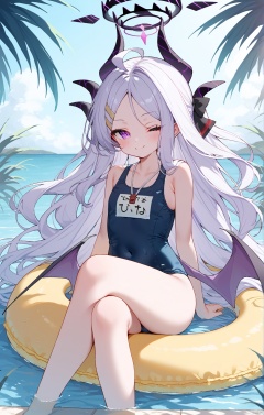 (score_9,score_8_up,score_7_up), 1girl,solo,(masterpiece:1.3),( beautiful:1.2),(high quality:1.2),(finely detailed:1.2),extremely detailed CG unity 8k wallpaper,best quality,a very delicate and beautiful,perfect fingers,1girl, solo, long hair, looking at viewer, smile, bangs, hair ornament, sitting, purple eyes, collarbone, swimsuit, ahoge, white hair, one eye closed, wings, horns, hairclip, water, one-piece swimsuit, parted bangs, halo, school swimsuit, crossed legs, demon horns, demon wings, innertube, blue one-piece swimsuit, name tag, pool, low wings, whistle, multiple horns, whistle around neck, hina \(blue archive\), hina \(swimsuit\) \(blue archive\)
