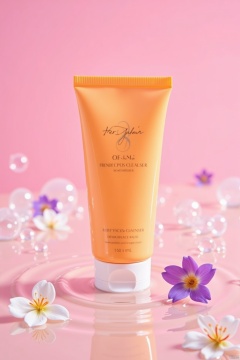 Image generation information: Advertisement shooting,a high-end packaged orange facial cleanser placed on water ripples,white transparent bubbles,blooming violets,blurry foreground,bright pink background,clean,minimalist,Chen Jialiang style,still life photography,different perspectives,
