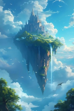 outdoors, sky, day, cloud, water, tree, blue sky, no humans, bird, cloudy sky, building, scenery, city, fantasy, cityscape, waterfall, floating island