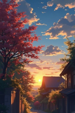 flower, outdoors, sky, cloud, tree, no humans, window, sunlight, plant, building, scenery, sunset, sun, house